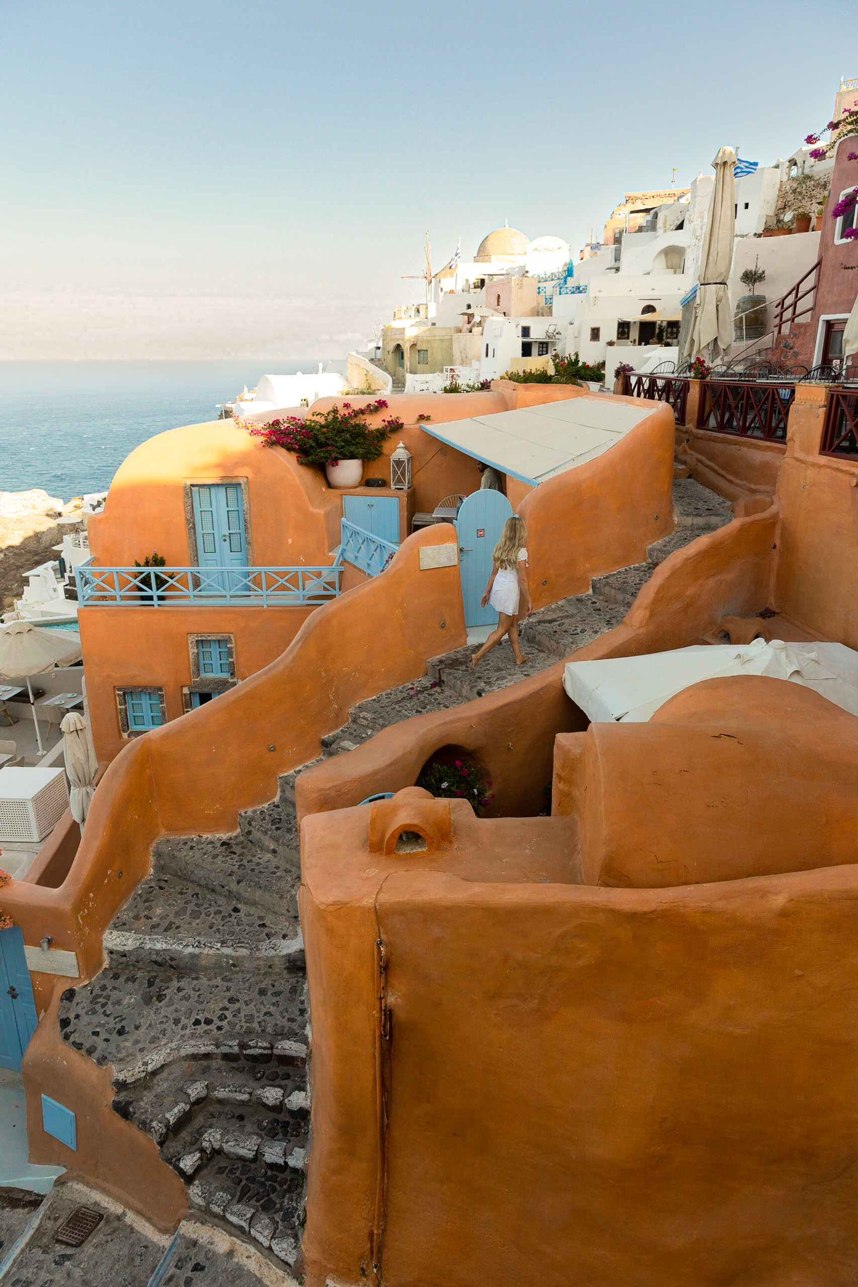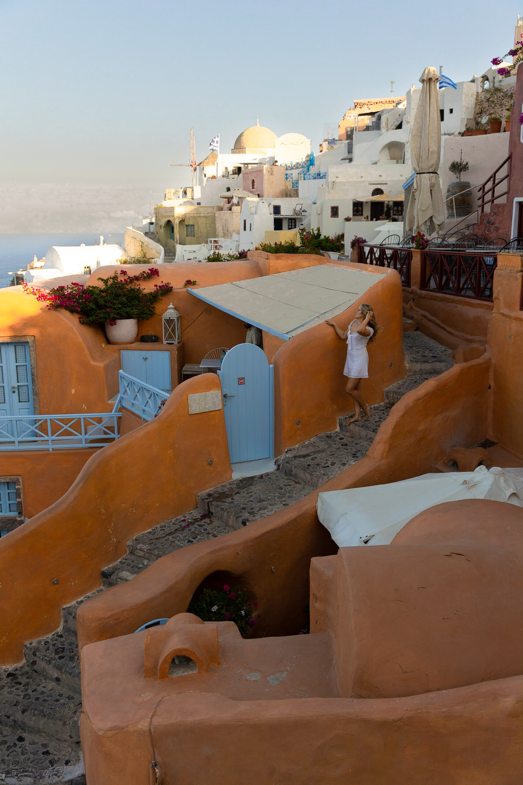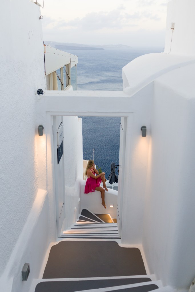 Another spot we found during our sunrise exploration was just inside the gates of Delfini Villas if you are looking to find it. I loved the way the steps were painted a smooth grey and white and how this spot looked directly out to the sea. If you don’t find this one there are so many different opportunities to take a picture like this in Oia. The gates were open at this hotel since it led to the reception but I would still recommend you go at sunrise as to not bother any of the guests staying there.