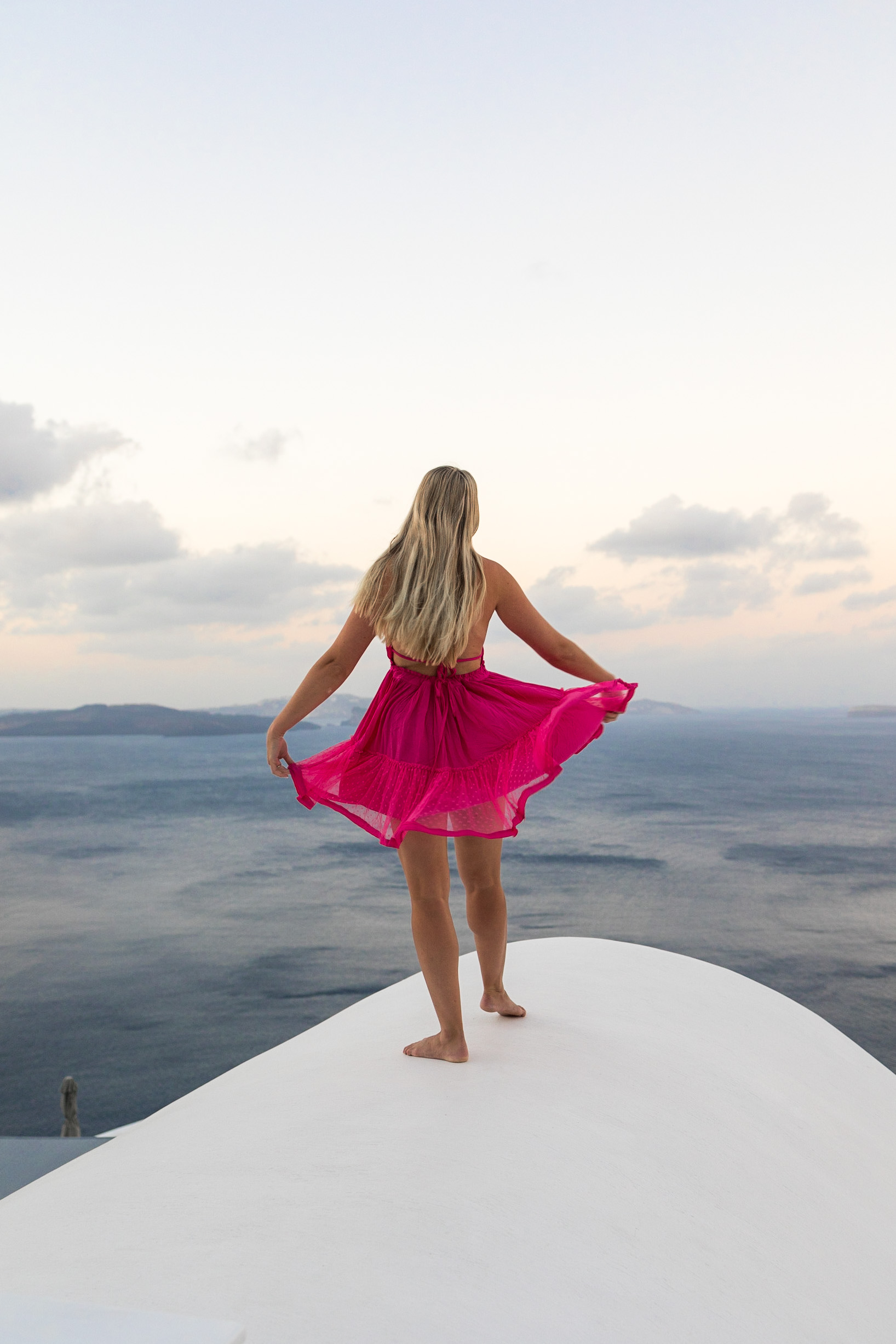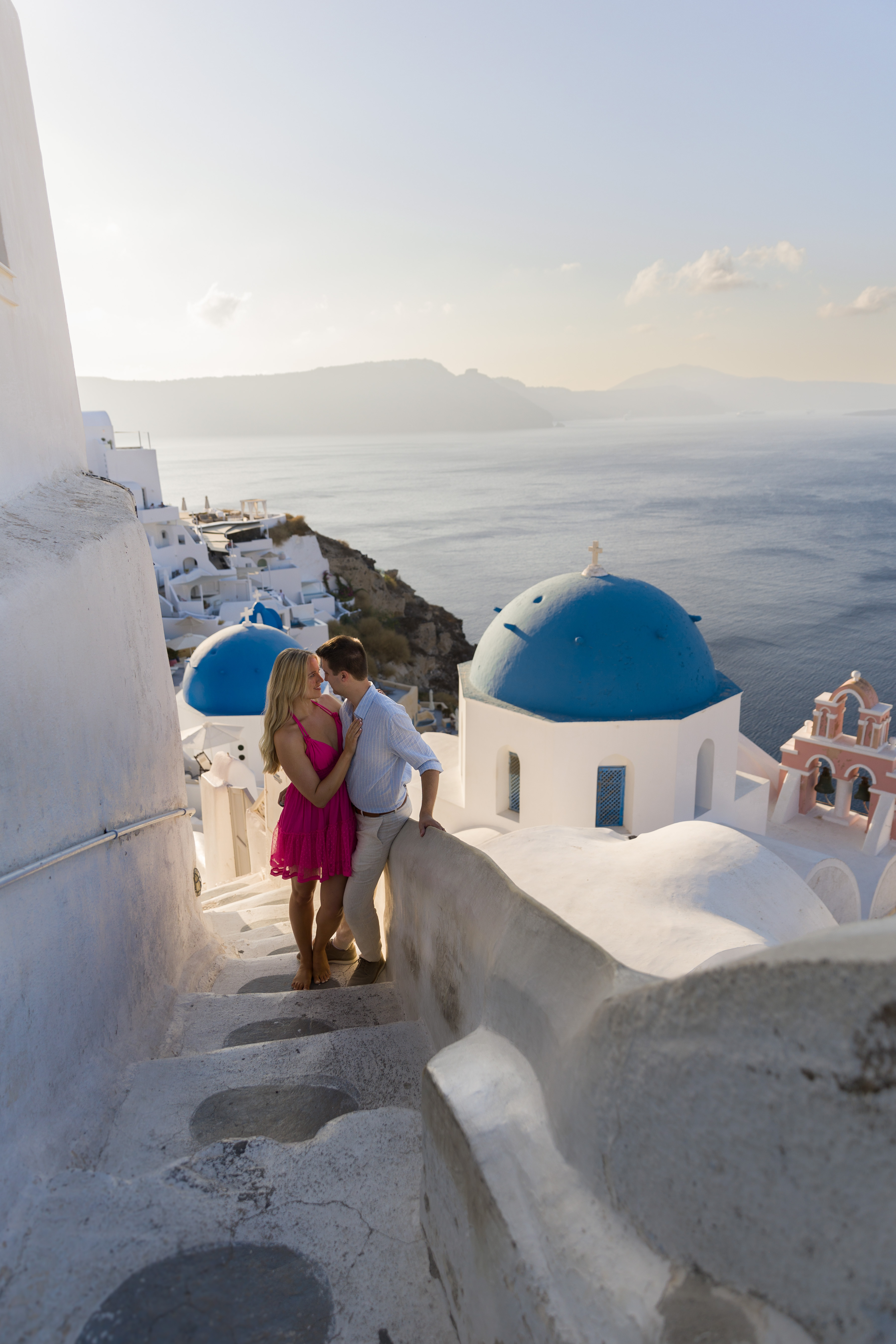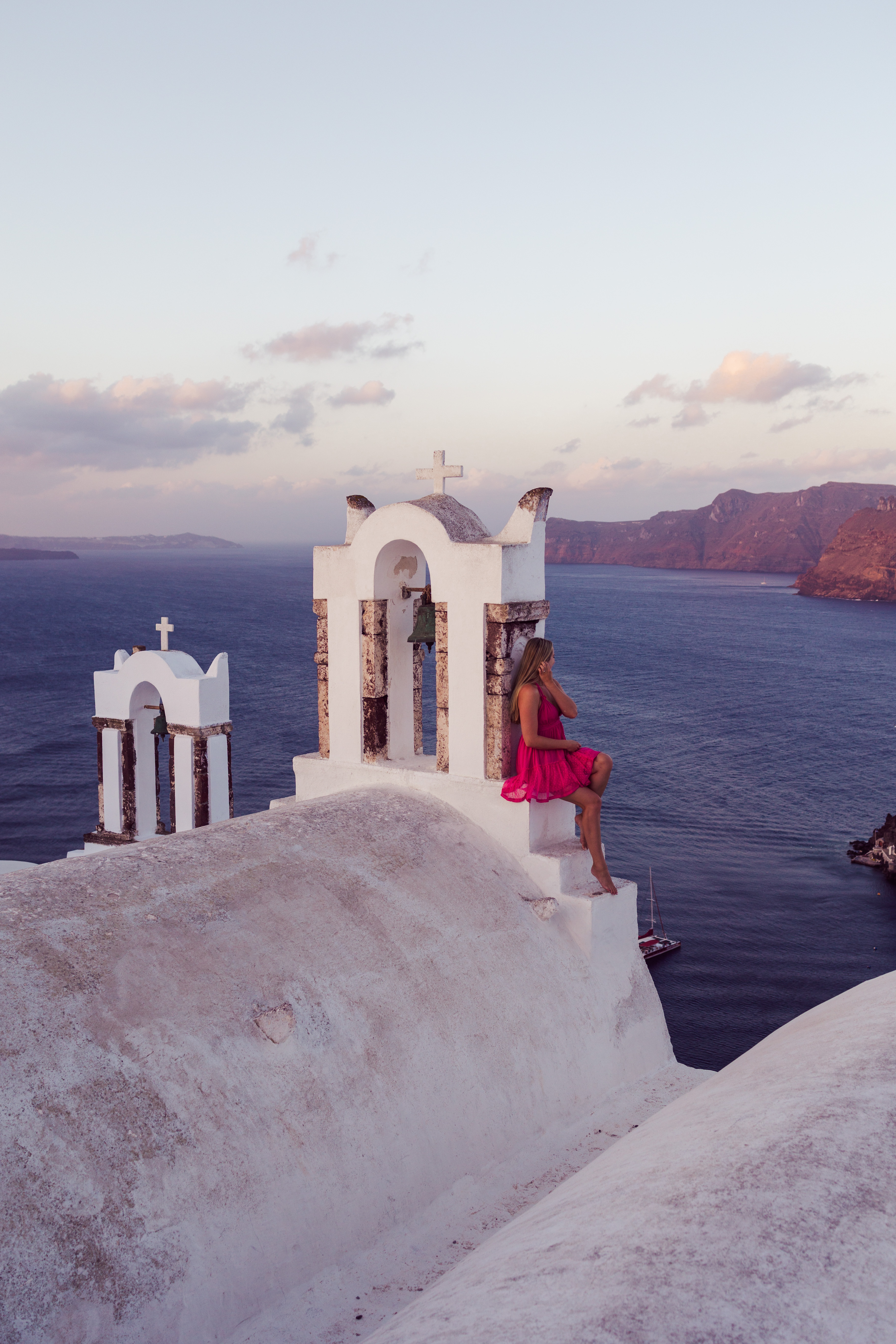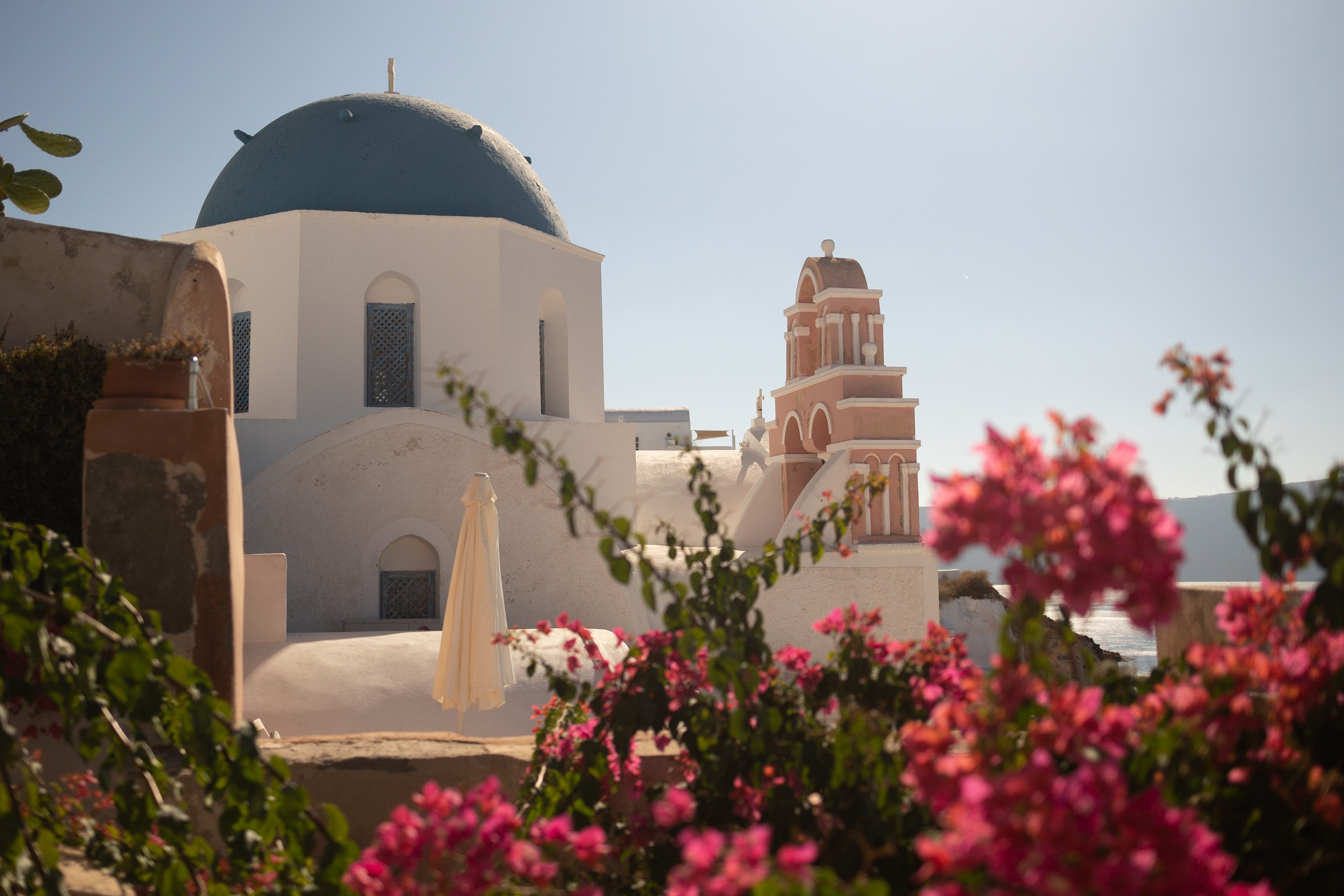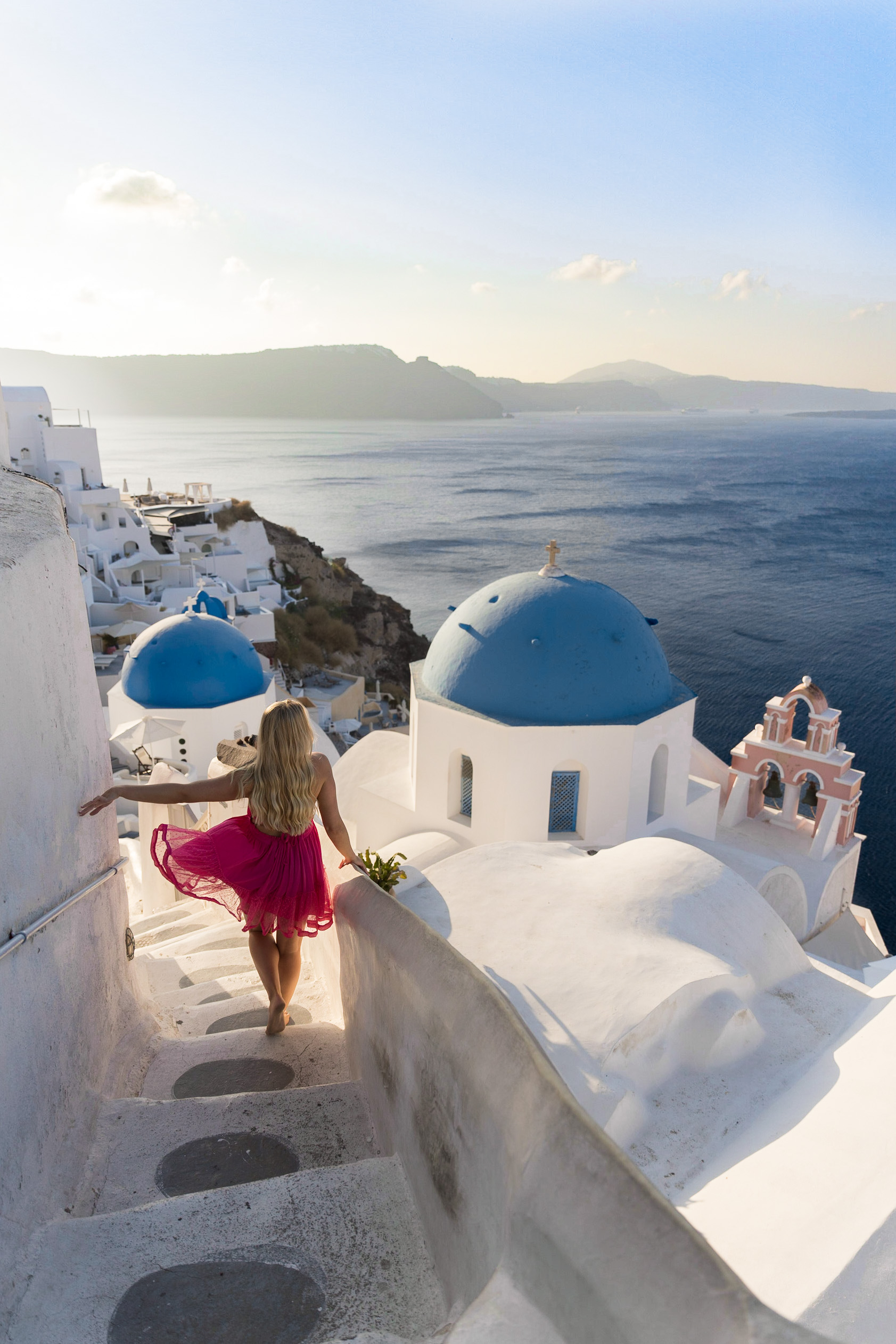 While most people are crowding around the private entrance to the domes another unique perspective of the famous blue dome and pink bell tower is from a ledge on the west side of the church. A large pink bougainvillea tree peaks out from behind the ledge which makes this location even more magical. The sun was rising directly behind us at the time we were there and I still cannot get over the color of the sky in our photos.