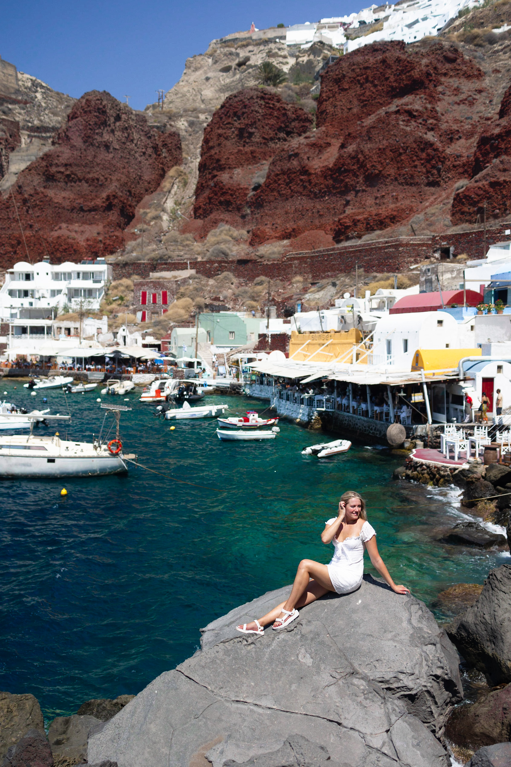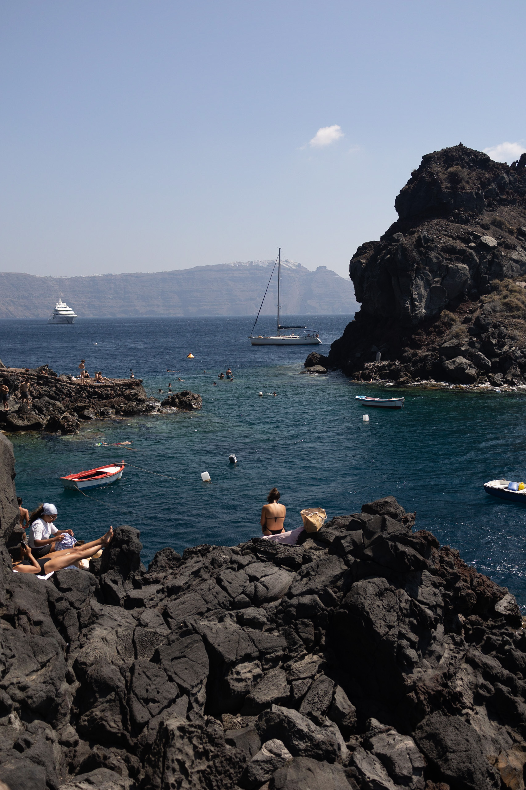 If you crave a little adventure, from the main restaurant area of Ammoudi Bay continue along the cliffside to find the secret beach which is technically called Armonia Beach. The “beach” is actually a rocky area that fair warning you will need to climb. I packed water shoes in my bag. I’m so glad we decided to check it out. The water felt amazing after our long hike down to Ammoudi. If you can muster up the courage you can even swim out to a rock formation and cliff jump. Even if you do not jump I recommend swimming out there to see Santorini from a different perspective.