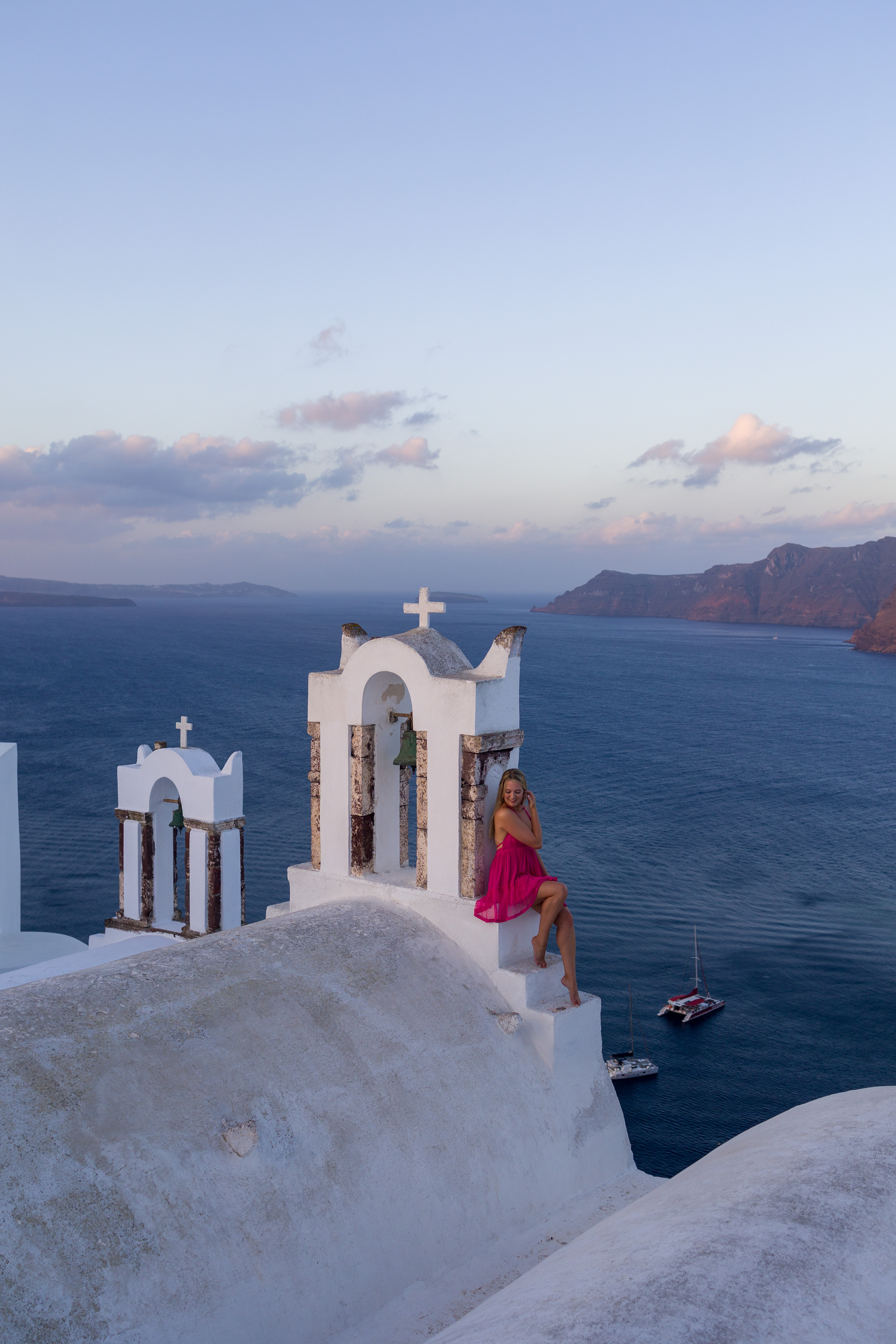 The three blue domes in Oia, Santorini, are a must-see for any photography enthusiast. Located on the northern edge of the village, these traditional Cycladic-style domes are the perfect backdrop for capturing the essence of the island. The striking blue and white color scheme of the domes contrasts beautifully against the deep blue of the Aegean Sea, making for truly breathtaking photos. There is a private path from the west side that leads you to the iconic view of the domes where you can also see the pink bell tower. There is a sign that states photos are allowed on the private property but make sure you are respectful. I recommend waking up early for sunrise photos in this location due to this being such a sought after photo spot.