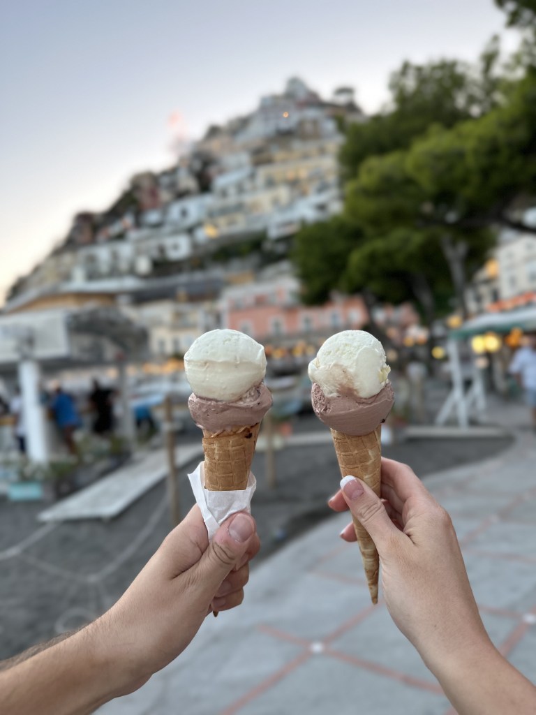 No trip to Positano is complete without a day at the beach. We opted for the main beach in the center of town Spagglia Grande. You can rent beach loungers at the beach club. We grabbed takeaway pizza at a nearby pizza restaurant and brought it to our loungers. Over near the ferries you will find much more affordable food and drink than the bars on the beach. Make sure a limoncello spritz, lemon sorbet in a lemon, and gelato are all on your list.