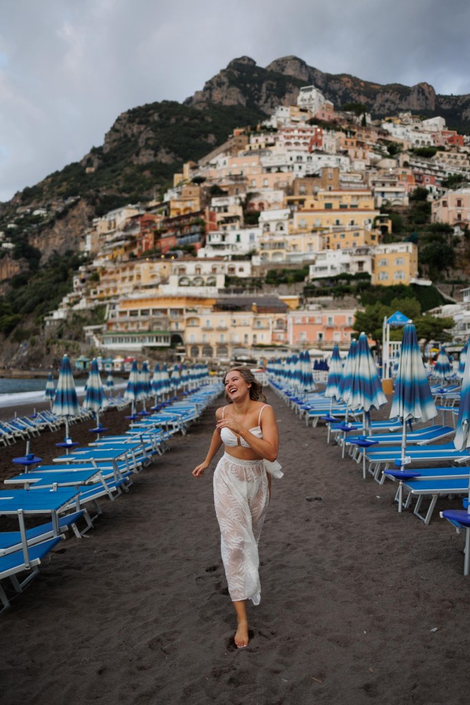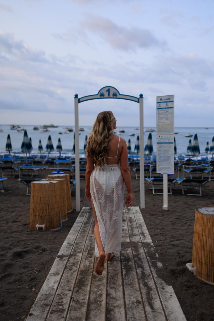The main spaggia or beach in Positano has rows and rows of bright blue chairs and umbrellas. With the colorful cliffside houses as its backdrop it’s really a stunning sight. This beach gets busy fast as its the main beach in the center of town so get there at sunrise if you want to see it empty.