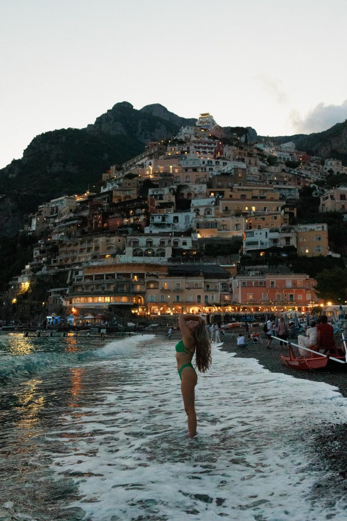 Blue hour (the hour after the sun sets) is magical on the main beach of Positano. The lights begin to turn on and sparkle as they reflect onto the water. Its pretty spectacular when there’s no light left in the sky (middle bottom photo) as well but blue hour will photograph better.