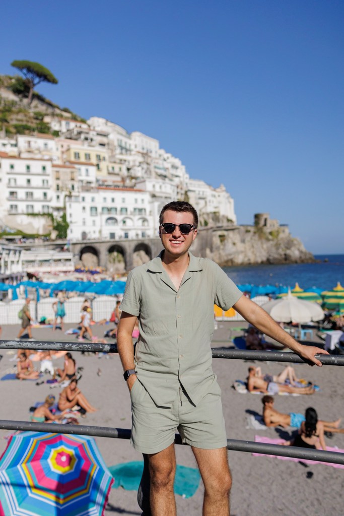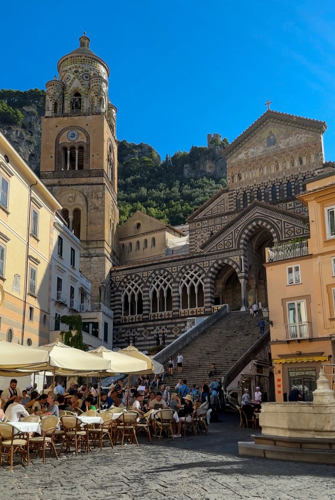 Strolling along the beachside promenade in Amalfi was the perfect way to soak in the townβs coastal charm. The fresh sea breeze, the sound of waves lapping against the shore, and the endless stretch of colorful beach loungers and umbrellas created the most picturesque scene. We took our time, admiring the deep blue of the Mediterranean, watching boats come and go from the harbor, and enjoying the lively energy of the waterfront. Along the promenade, charming cafΓ©s and shops lined the way, offering everything from fresh gelato to handcrafted ceramics.