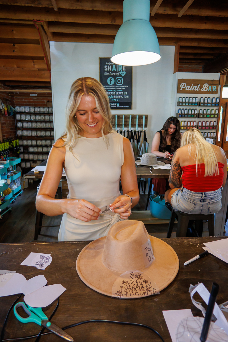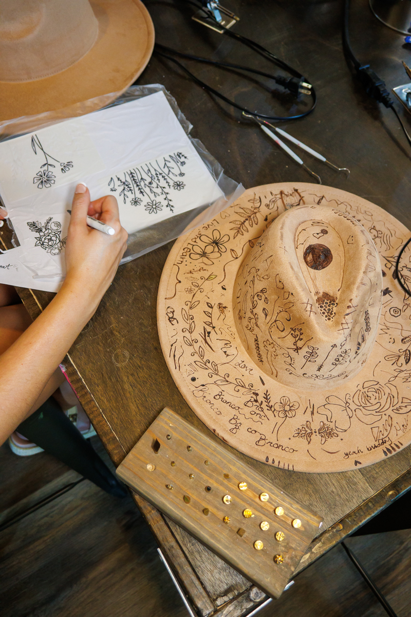 In the afternoon, we tried something totally new, a hat burning class at AR Workshop. Under the guidance of our instructor, we used leather burning tools to create designs on western hats. It was a really creative and unique experience and was cool to leave with a custom hat we’d actually wear on future trips. There was also a selection of suede baseball caps for men to participate in too.